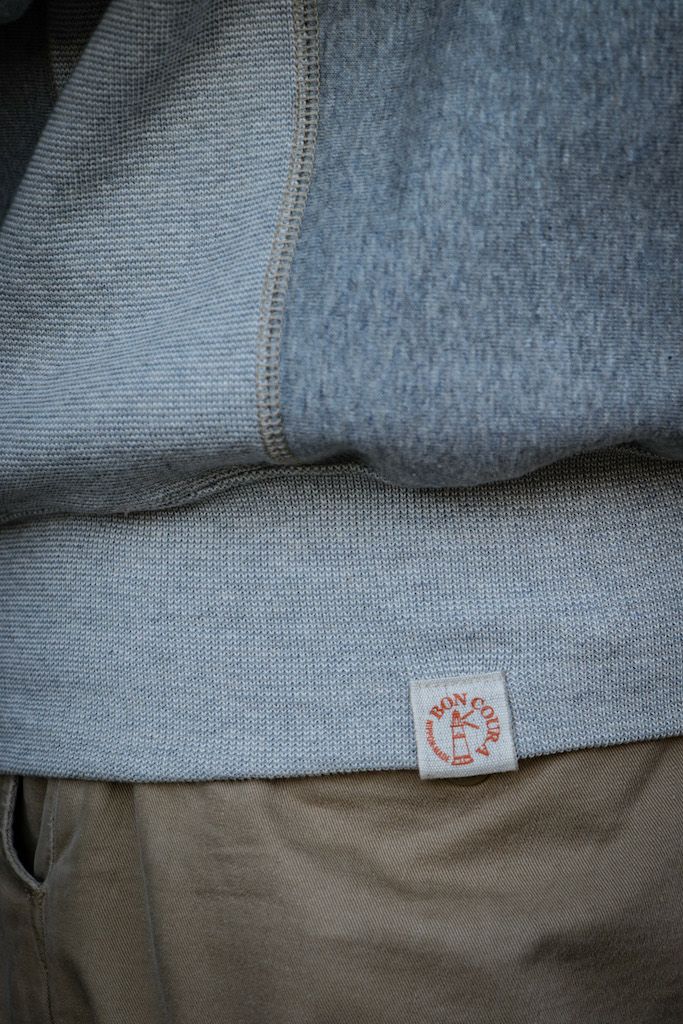 貴重な旧式の吊り編み機を使用し特殊な手間をかけることにより生地が作られています。非効率であるがゆえに他には無い風合いがあります。豊潤なウールのようなタッチと、もちっとした弾力のある肌触りの生地は原材料から編み立て仕上げに至るまで妥協せず作り上げたBONCOURAならではの吊り裏毛生地のPARKAです。