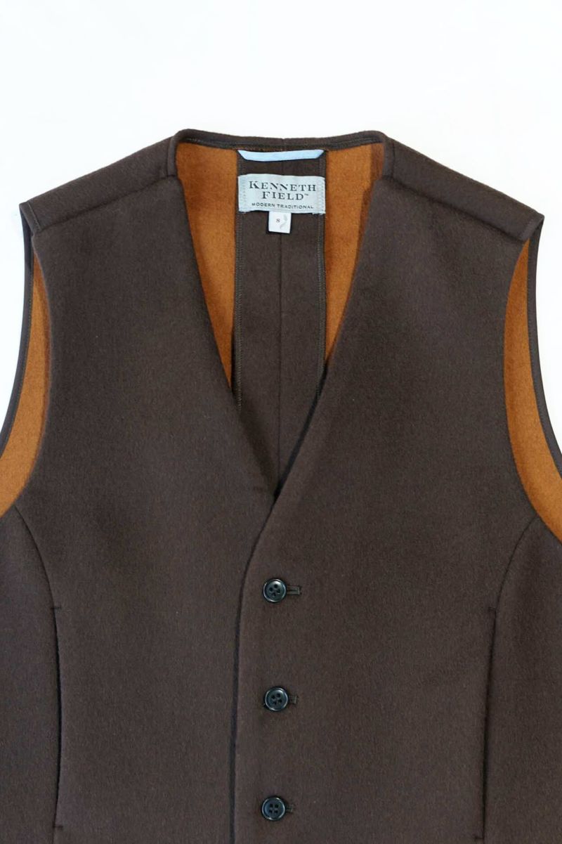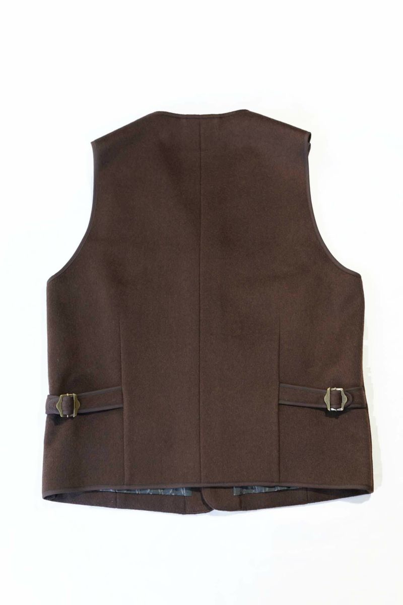 KENNETH FIELD 25AWのテーマ “Lodge(ロッジ)” を象徴するブラウンカラーをセレクト。ドレスとカジュアルの架け橋しとなるベストです。背面のバックルは通常ひとつのところを、ハンティングベストの要素を取り入れた二つのバックル仕様に。ウエスト調整だけでなく、デザインとしての存在感も際立ちます。フラップ付きポケットに加えシームポケットも完備した、KENNETH FIELDらしい特別感のあるディテールです。裏地には鮮やかなオレンジを配し、オリジナルのリーフ柄をあしらったキュプラを使用しています。