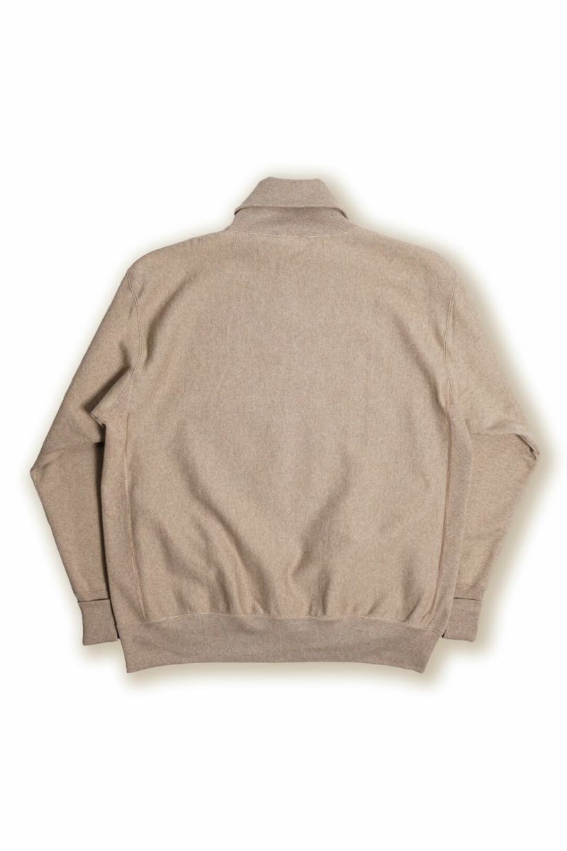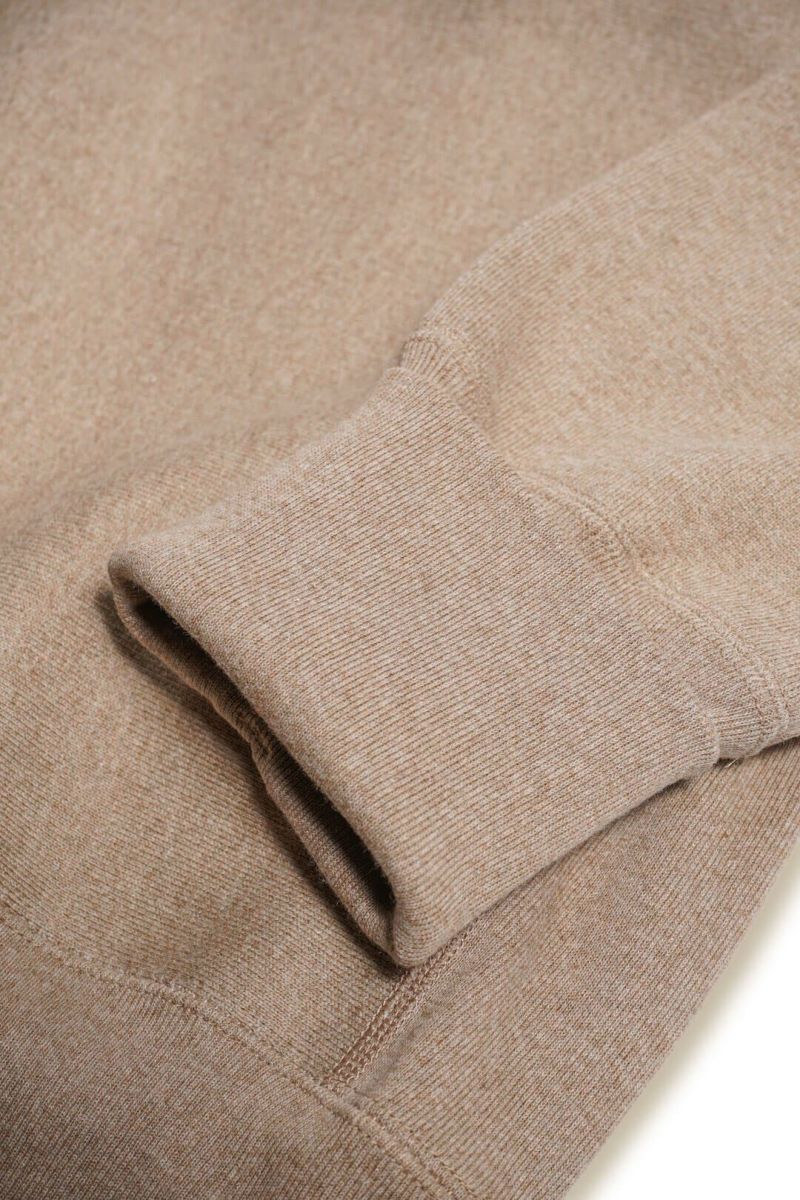 定番の26/2のBD系を使用したタートルネックスウェットです。素材は表糸に26/2のBD糸(空糸)を使ったスウェット地。元々硬めのBD糸を双糸にして、さらに詰めで編み立てる事でシャリ味のあるバルキーなタッチに仕上げています。裏のパイル面は細かくフル起毛させることで、保温性を高め、しなやかな肌触りになっています。