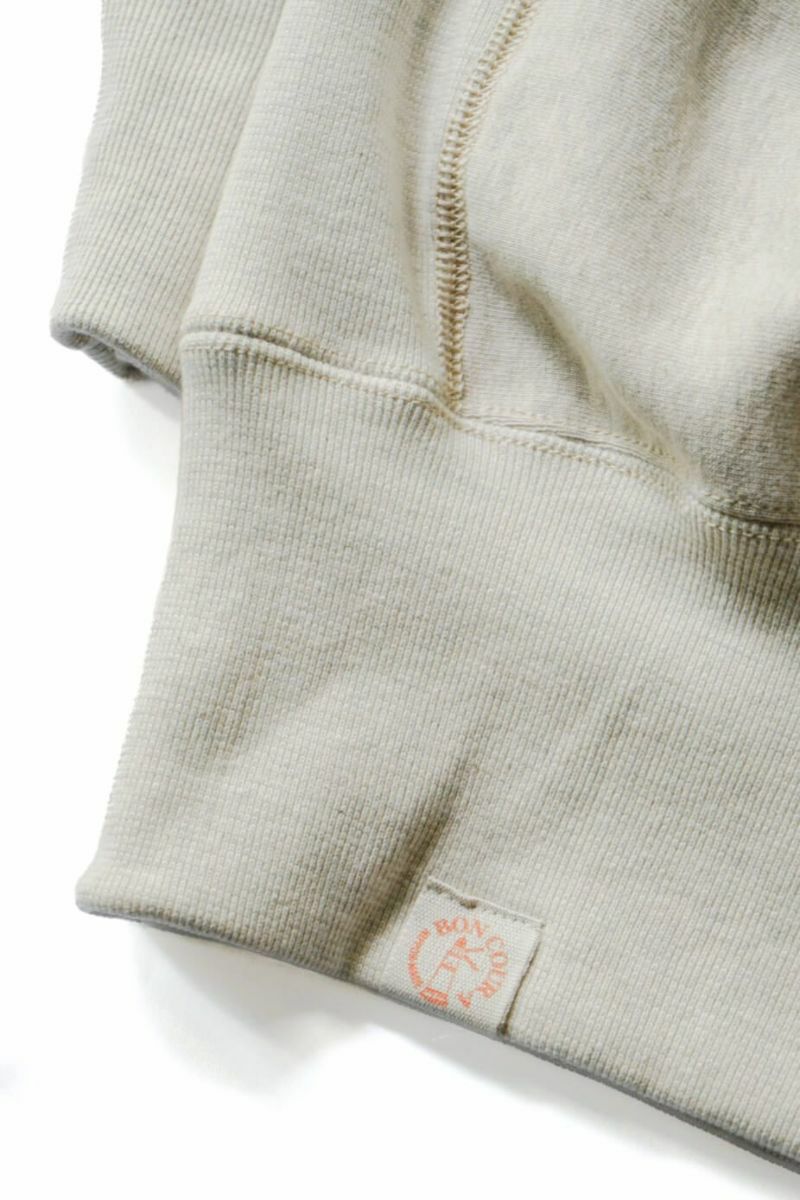 豊潤なウールのようなタッチと、もちっとした弾力のある肌触りの生地は原材料から編み立て仕上げに至るまで妥協せず作り上げたBONCOURAならではの吊り裏毛生地のSWEATです。