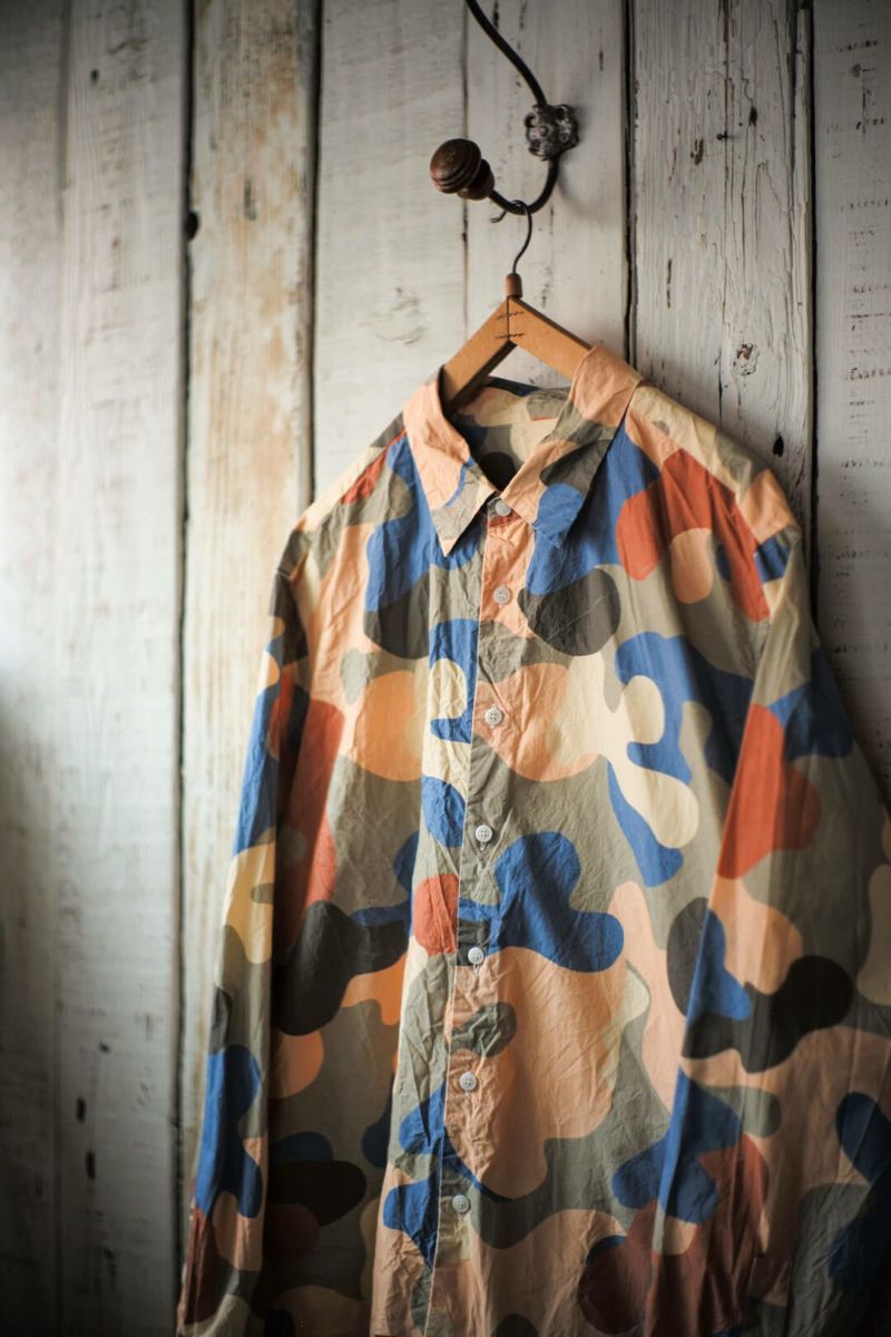 CASEY CASEYから新作のシャツが届きました。ミリタリーの色味が色濃く反映されたカモフラージュ柄を落とし込んだ一枚。ミリタリーが持つ無骨さを感じさせないのは、CASEY CASEY特有の柔らかい空気感にあります。色味を落ち着かせてありそうでないパターンに。ゆったりとしたシルエットもまたCASEY CASEYらしい部分です。一枚で着てもよし、ジャケットのインナーに着てもコーディネートに映える一枚です。