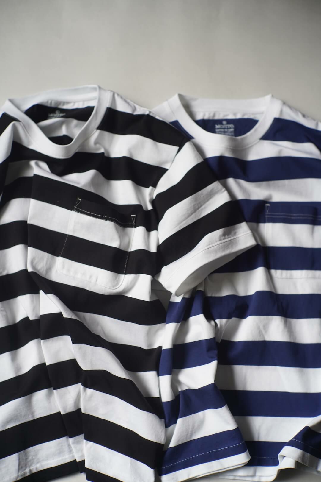 ワイドピッチのボーダーポケットTシャツ。程よく厚みのある天竺生地はインナーとしても1枚でも活躍します。 100% COTTON MOJITO / SANTIAGO "B" STRIPE T Price ¥19,800(税込)