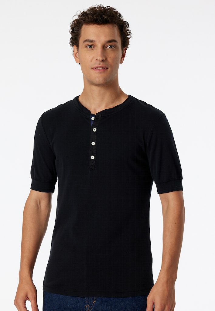 Schiesser Revival(シーサーリバイバル) 1875年創業のドイツの老舗インナーウェアメーカーSchiesser(シーサー)定番の「カールハインツ」のヘンリーネックカットソー。1950年代のデザインをベースに、フロントボタンは貝ボタン仕様、ヘンリー部分のブルーラインのテープがアクセント。ファブリックの素材は高級綿のマココットン。古いニッティングマシーンで織り上げる生地は空気を含みソフトな肌触りです。シャツやカーディガン、ジャケットのインナーとしてはもちろん、一枚着としても活躍するアイテムです。 <素材> COTTON 100% <生産国> MADE IN EUROPE Schiesser Revival / KARL-HEINZ Henley Neck 1/2 (Short Sleeves) - Black PRICE : ¥14,300(税込み)