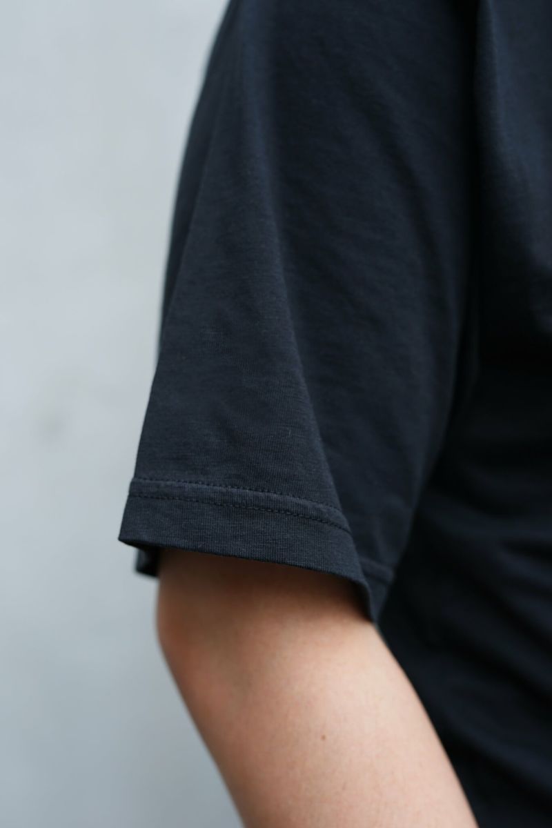 ワイドでボクシーなスタイルのTシャツ。シングルジャージー編みの生地は、天然ピマコットンの柔らかさやシルキーさを最も感じやすい生地です。細手の糸を用いて織られた軽くてふんわりとした生地は、伸縮性にすぐれています。気候やシーズンに関わらず、一枚でも着れる心地よい着心地のウェアとして活躍します。