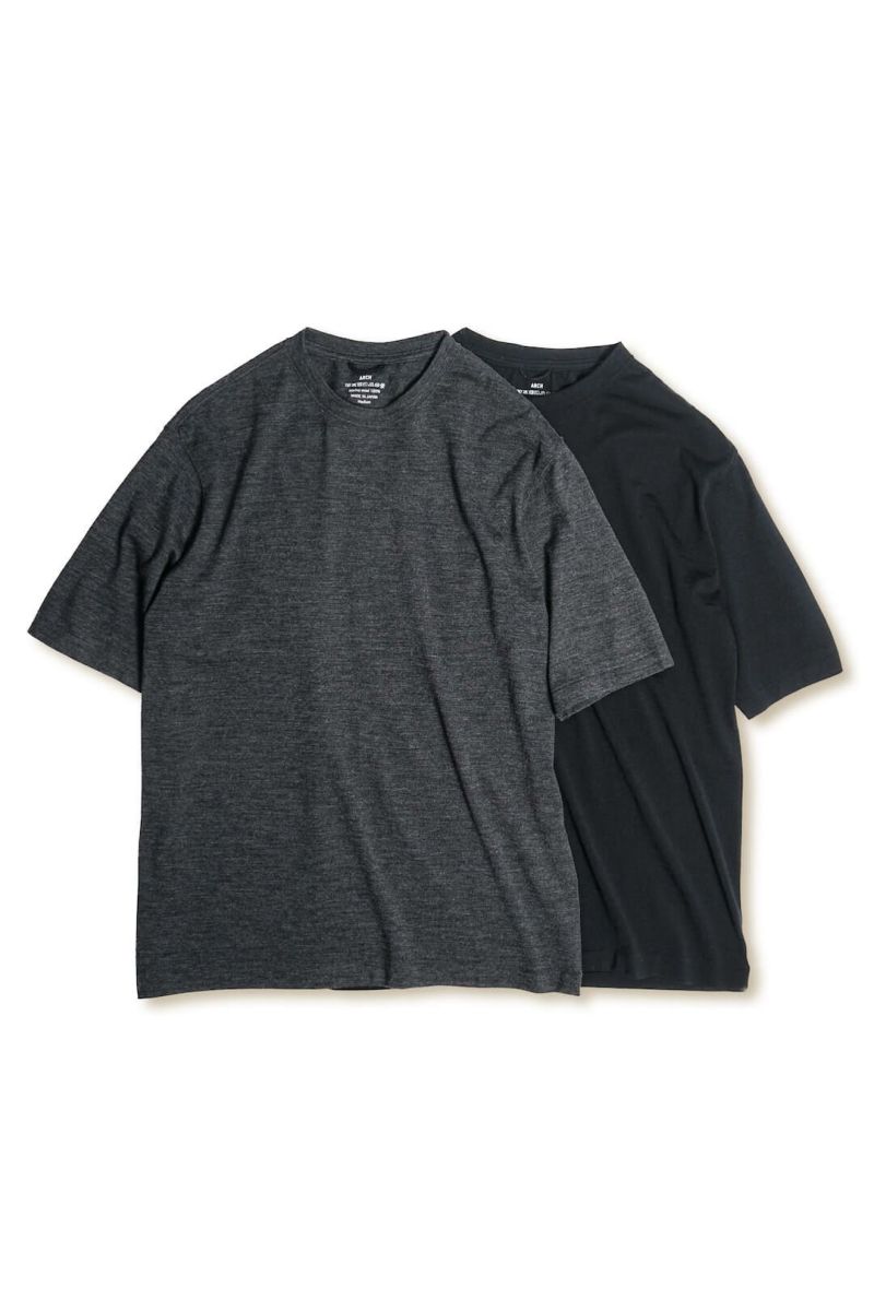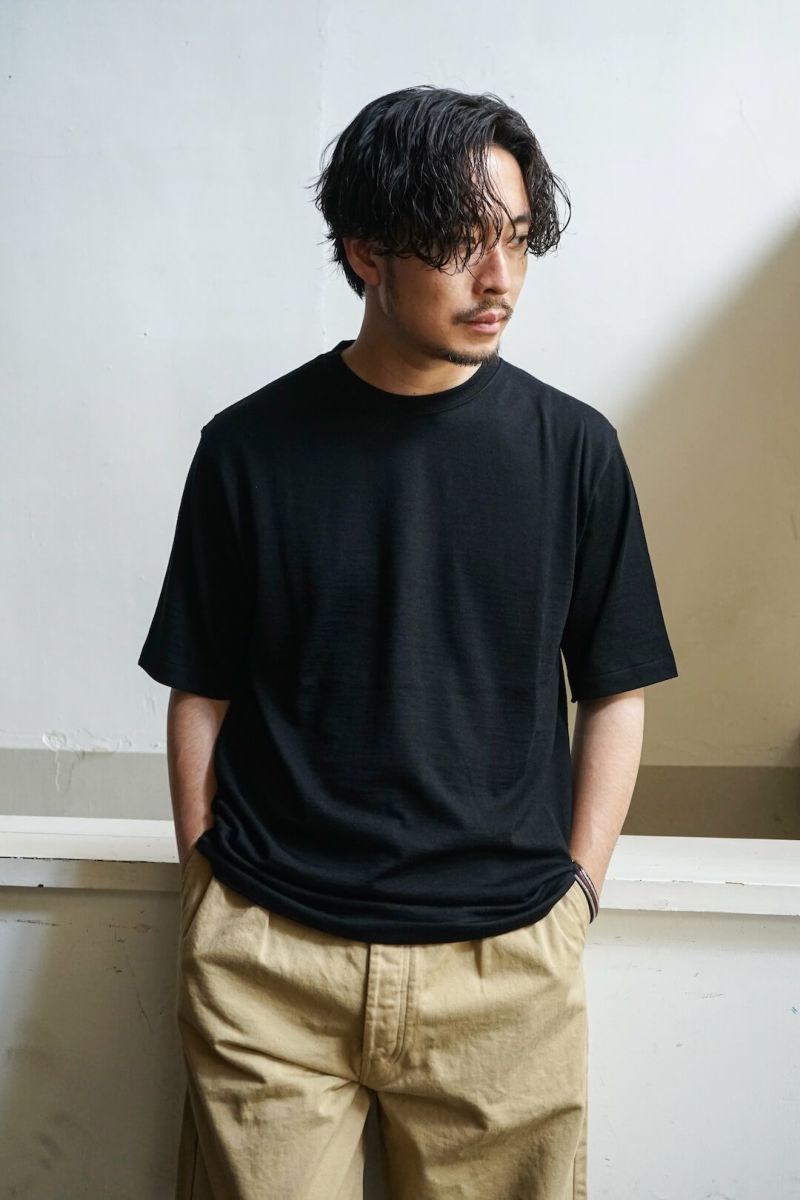 しかし、アウトドアブランドが展開しているメリノウールウェアは、あくまで肌着であるためタイトな物が多く、街着として一枚で着用するには不適。そこで、企画製作したのが「一枚で着れる」メリノウールのTEEシャツです。身幅はゆったりとさせながらも、首周り、袖周りはすっきりさせることで、インナー使いもし易いように考慮したシルエットになっています。