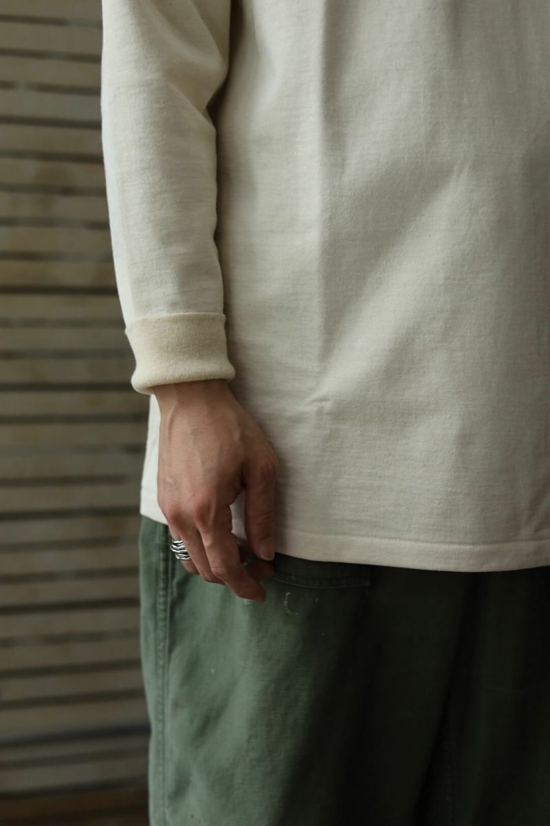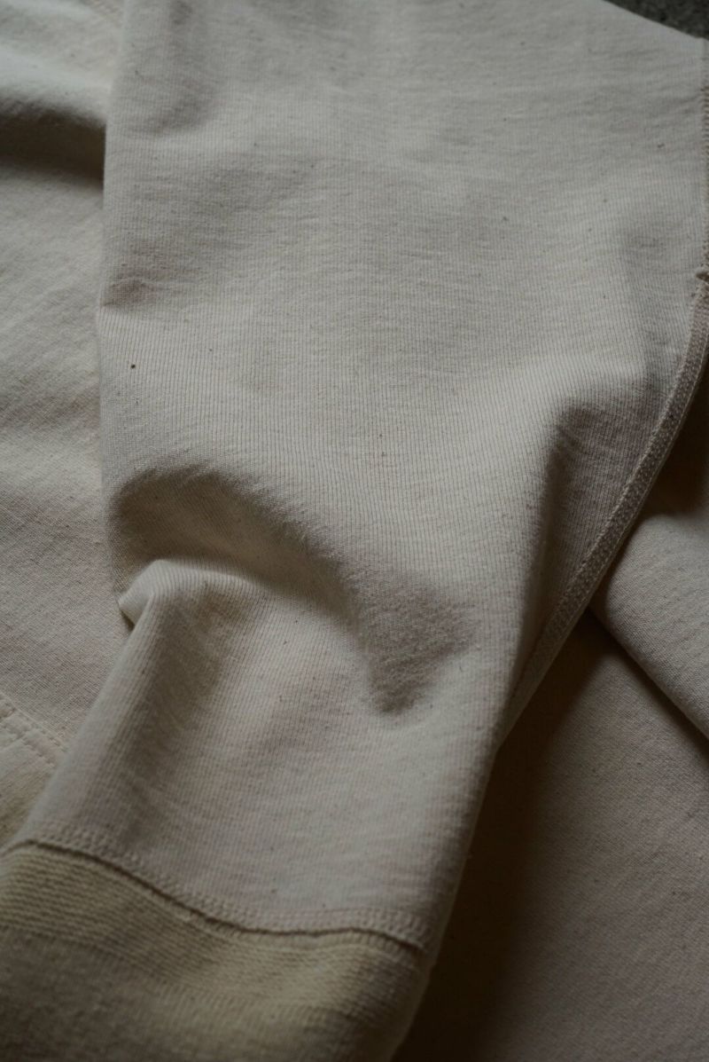 縫製には4本針フラットシーマを用い、袖口はフライスではなく編立の2段リブを採用するなど、細部までオリジナルのヴィンテージを検証したこだわりのつくりです。