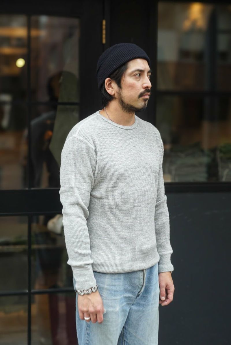 今回、米綿を用いた “88/12” 糸をゼロからオリジナルで開発。トライ&エラーを繰り返しながら約3年の歳月を経て、ようやく理想とする糸が完成し製作に至りました。サーマルの組織やシルエット、リブの仕様はアメリカ製のヴィンテージをベースにアップデートを施し、アンダーウェアとしてはもちろん、1枚でも着用できるサーマルシャツとなっています。