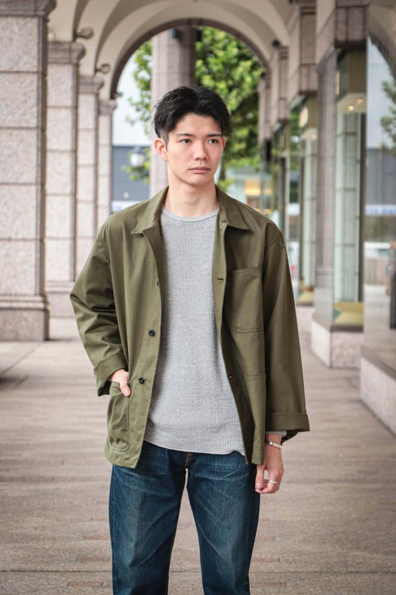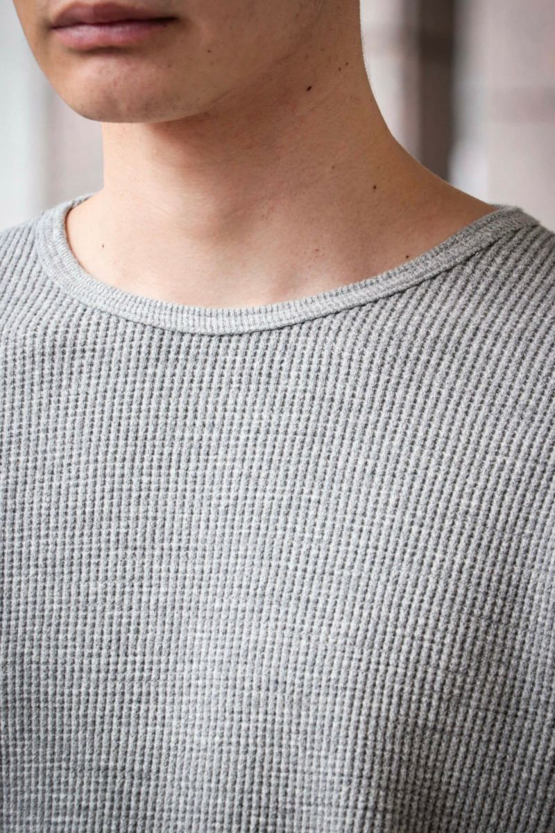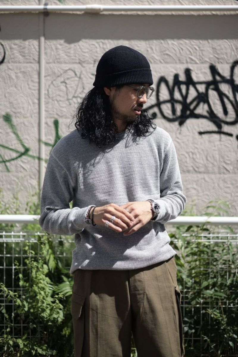 今回、米綿を用いた “88/12” 糸をゼロからオリジナルで開発。トライ&エラーを繰り返しながら約3年の歳月を経て、ようやく理想とする糸が完成し製作に至りました。サーマルの組織やシルエット、リブの仕様はアメリカ製のヴィンテージをベースにアップデートを施し、アンダーウェアとしてはもちろん、1枚でも着用できるサーマルシャツとなっています。