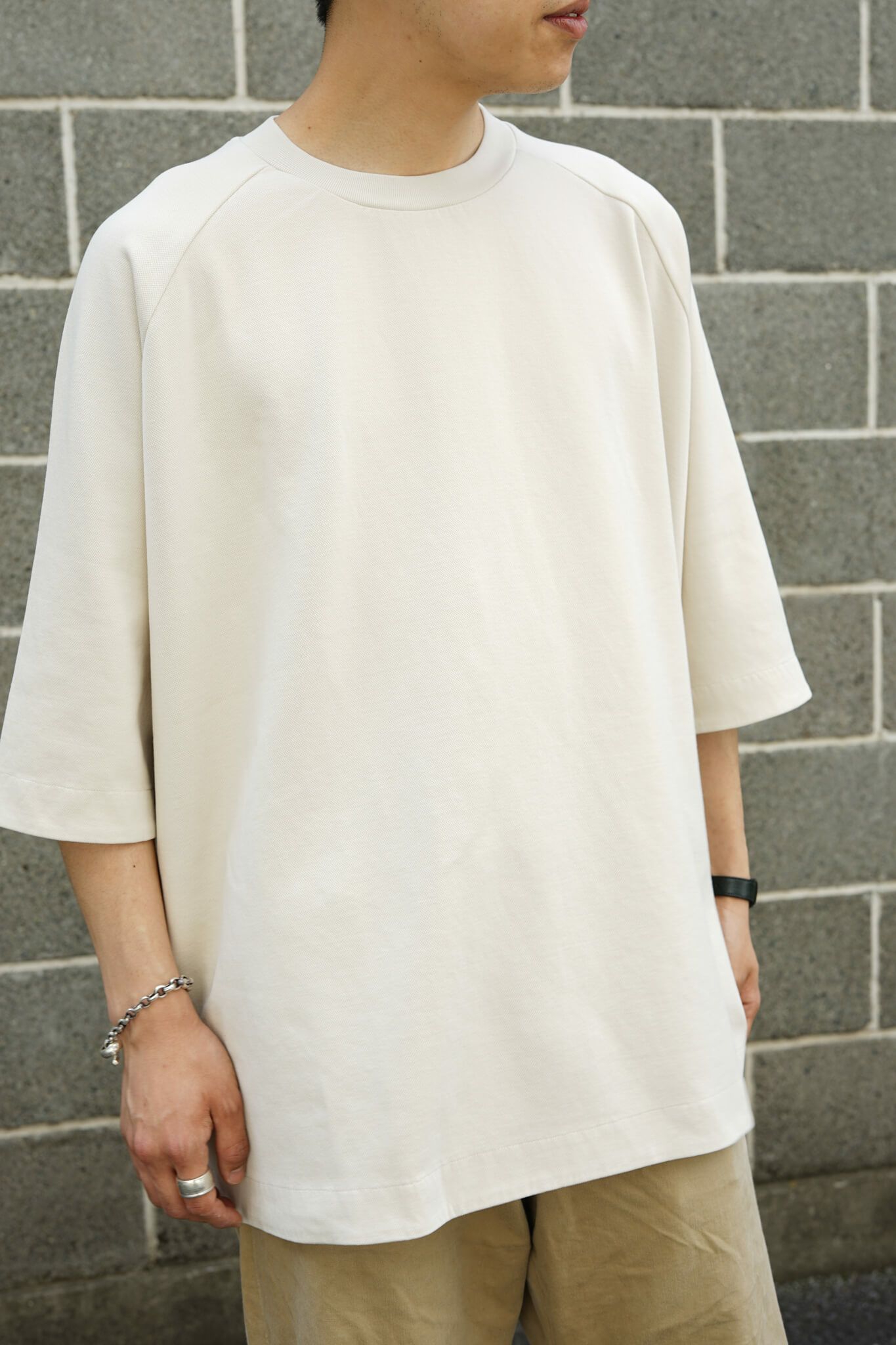 生地の表面に立体感のあるピケ・ジャージー素材のTシャツ。ラグランスリーブになっていて、身幅・着丈がたっぷりとあるビッグシルエットになっています。風合いも良く、とても滑らかなので着心地も抜群。一枚で着やすい厚さなのも魅力的です。