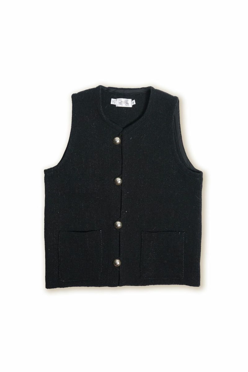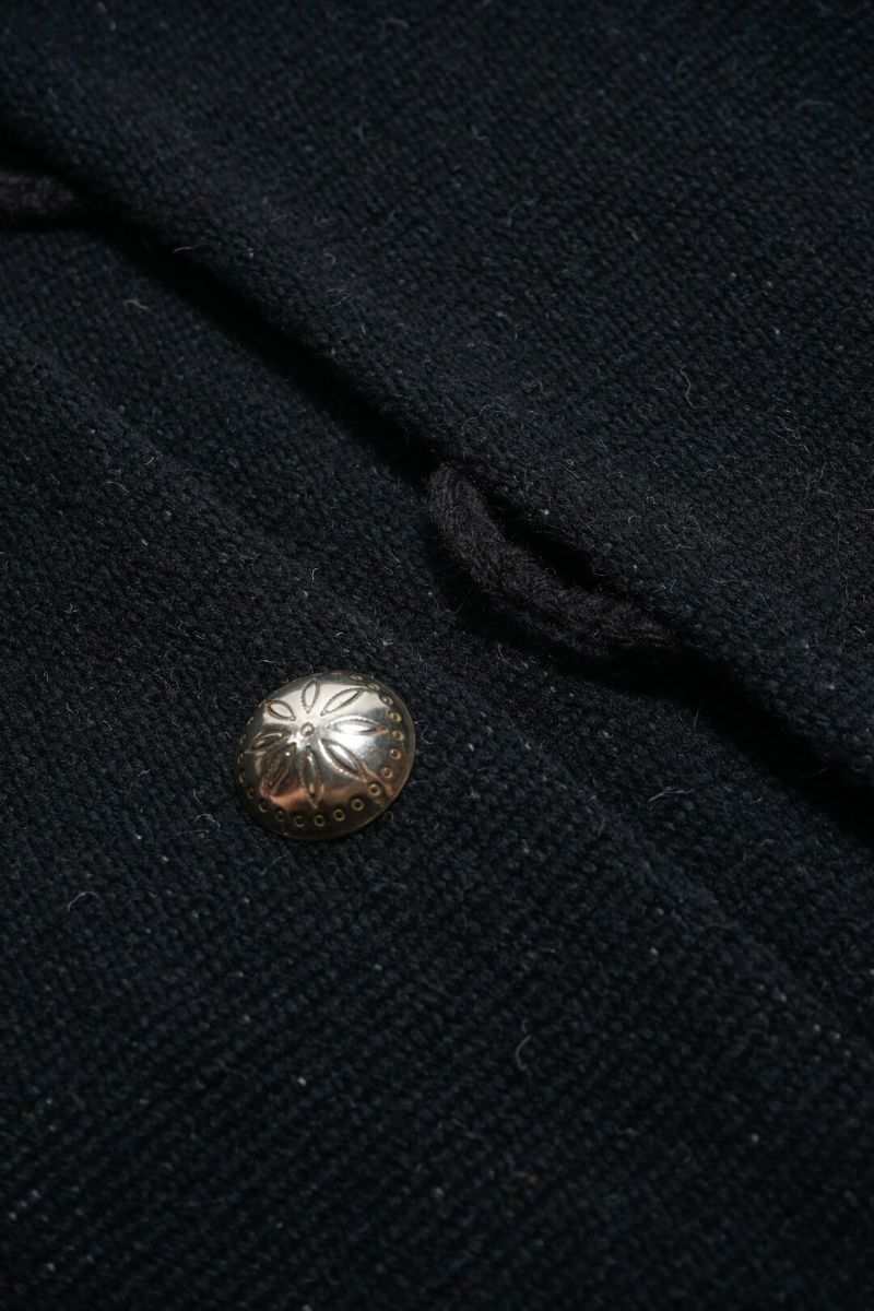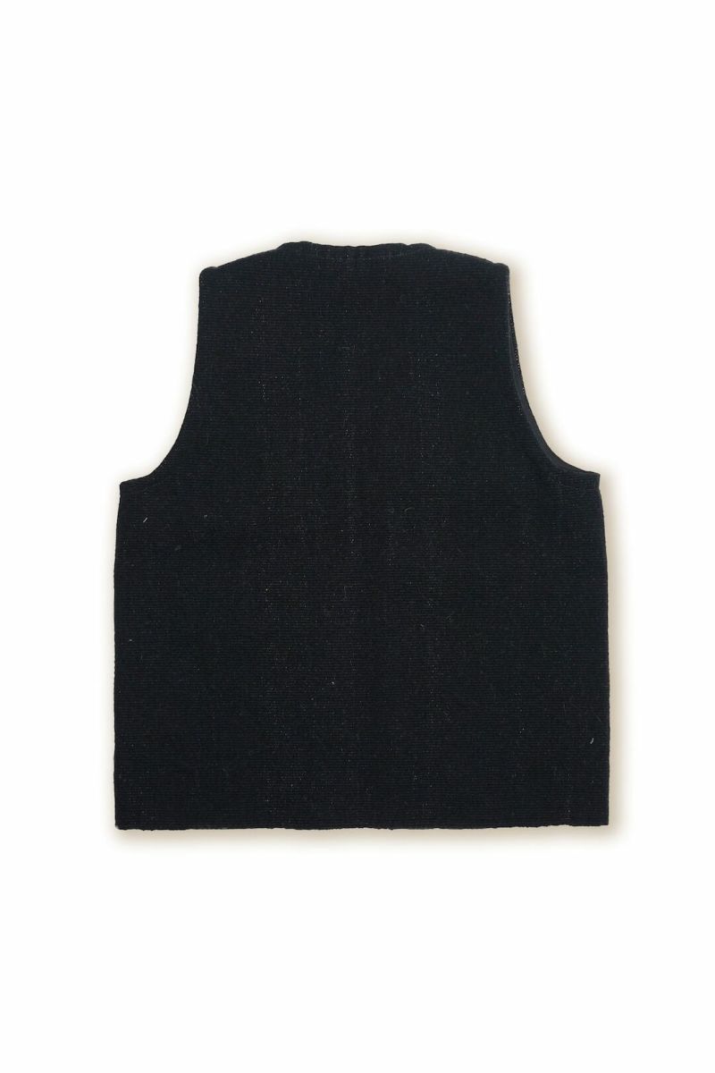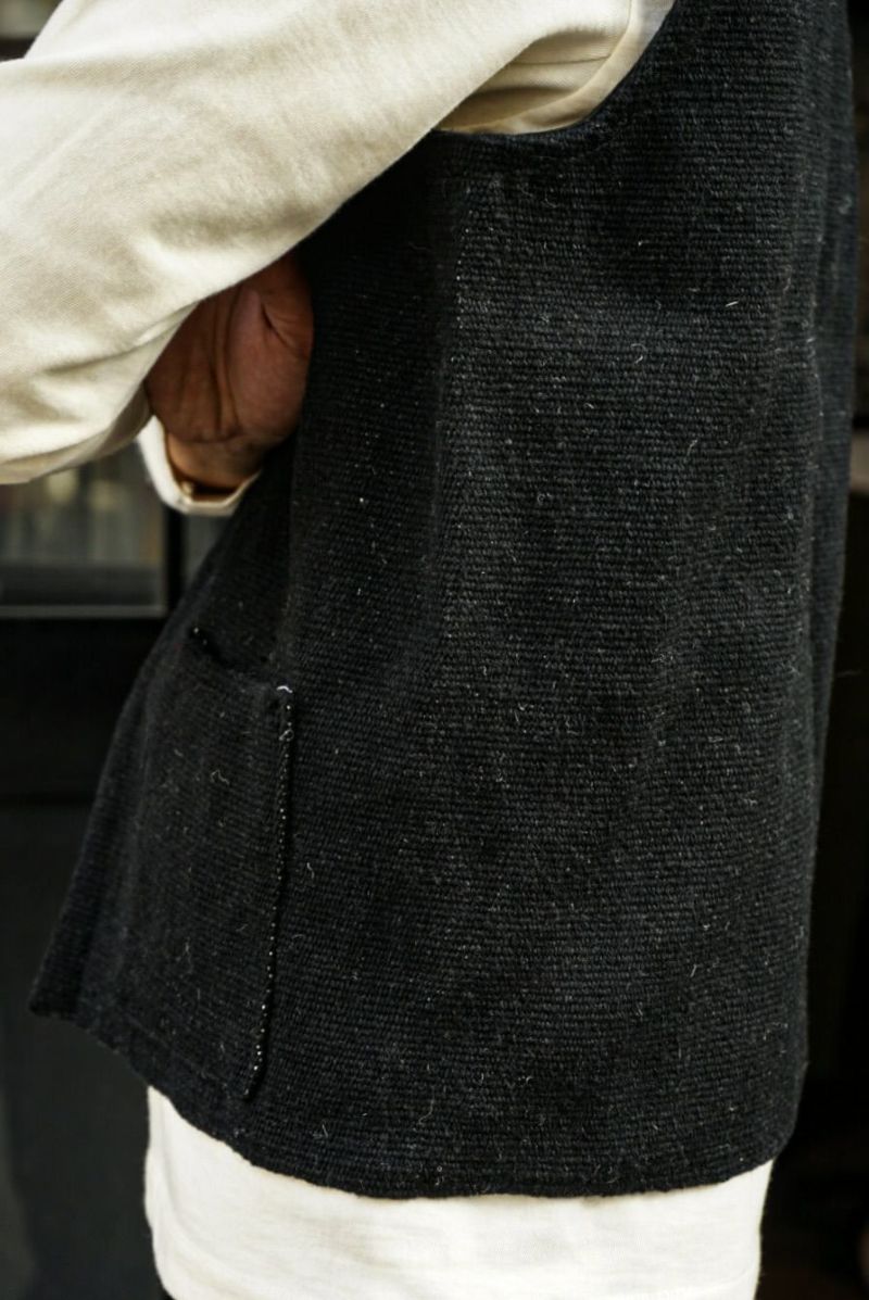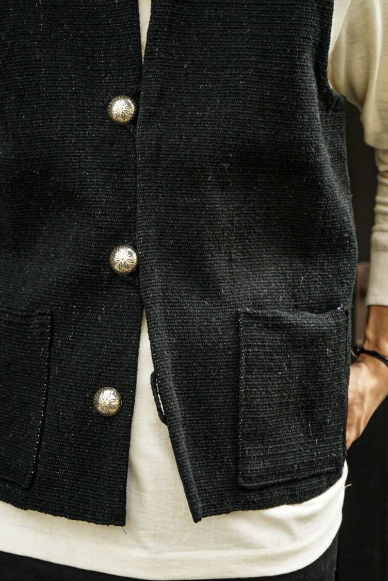 17世紀後半、現在のアメリカ・ニューメキシコ州に入植してきたスペイン系移民にルーツを持つ、手織りの伝統工芸品、チマヨブランケットを使用したチマヨベスト。チマヨベストと言えば、いわゆるチマヨ柄と呼ばれる独特な模様を施したものが代表的ですが「様々なスタイルに溶け込む1枚を」と言うことで、あえて無地のブラックで別注オーダーしました。首元のデザインは、チマヨベストには珍しいラウンドネックを採用しています。浅すぎず深すぎずの絶妙なラウンドは、シャツはもちろん、カットソーやセーターまで、合わせの幅がとても広いいです。脇剥ぎ(サイドシーム)の無い、丸胴仕立てであることは他の地マヨメーカーには無いTRUJILLO’Sの特徴。織り上がった 1枚のブランケットを裁断・縫製してベストに仕立てるという、伝統的な製法を守り続けています。