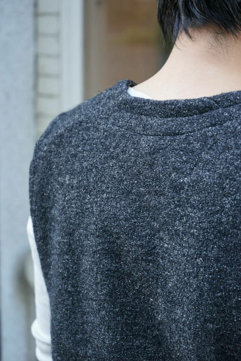 素材は、ウールリネンの混紡糸を横編み機で編み立てた後に、縮絨(フェルト)加工を加えて、保温性、耐久性を高めたオリジナルファブリック。
