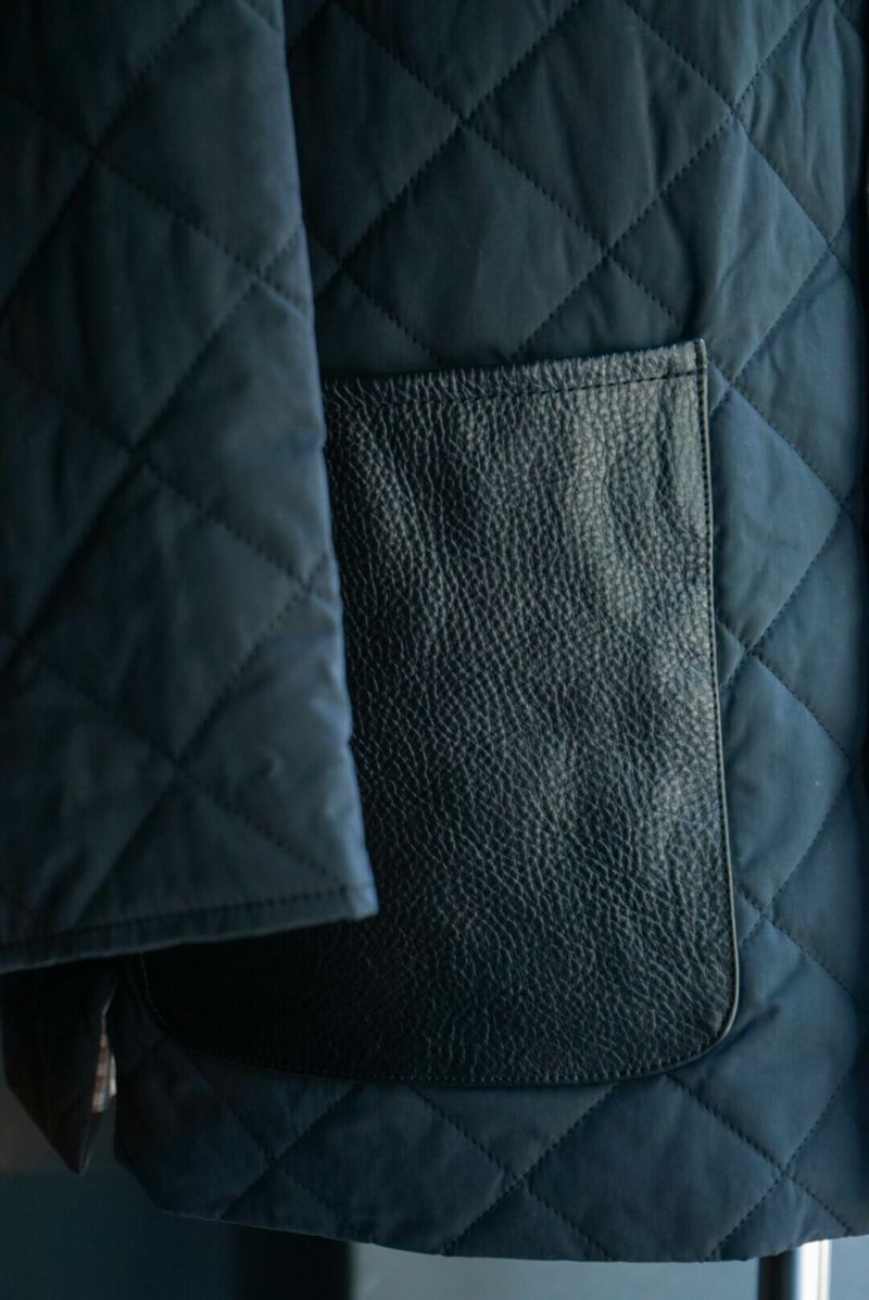 その当時の割繊技術を使ってフランス伝統のスクエアキルト素材に加工し、当時パリを席巻していたH社のキルティングJK風に仕上げました。襟には英国ブリベンモスのコーデュロイ、さらにサイドスリットも施されています。